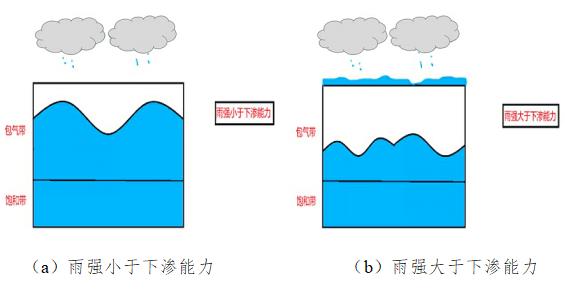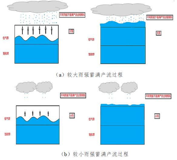 (1)掌握蓄满产流、超渗产流的产流条件及微观机理,如图7、图8所示。运用蓄水容量曲线法计算蓄满产流的产流量,运用初损后损法计算超渗产流的产流量。
